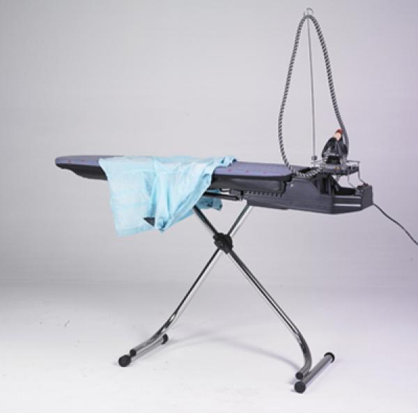 Das Dampfdruckbügelsystem ist praktisch und äusserst handlich. So lässt es sich durch Gasdruckfedern schnell und spielend Aufstellen und Zusammenklappen. Der Dampferzeuger hat einen 1,8 Liter Vorratstank, der mit destilliertem Wasser oder auch Leitungswasser permanent befüllt werden kann (für unterbrechungsfreies Büglen). Er lässt sich samt Bügeleisen abnehmen, um beispielsweise zerknitterte Gardinen komfortabel direkt am Fenster glattzudampfen.